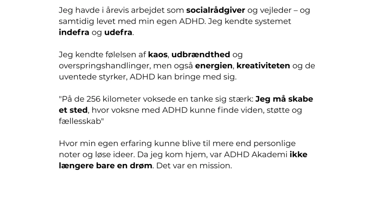 Jeg ved også, at Adhd ikke kun handler om begrænsninger, men rummer potentiale og styrker, der kan udfolde sig på nye måder - når vi får de rette strategier og rammer.